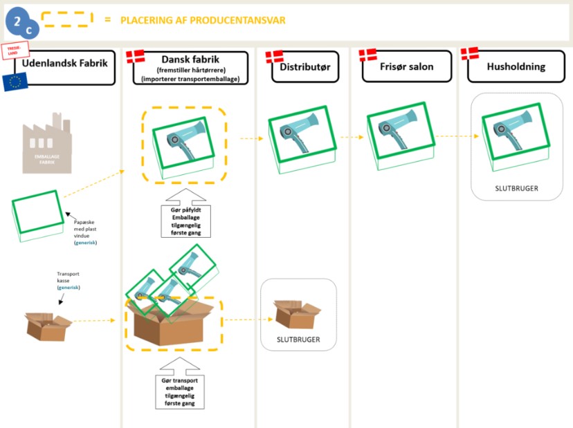 Virksomheden der tilgængeligøre den påfyldte emballage første gang på det danske marked, får producentansvaret eftersom varen er importeret. Transportemballagen der ender direkte ved slutbrugeren fra den udenlandske virksomhed, her vil det være den udenlandske virksomhed som har producentansvaret for den generisk transportemballage.